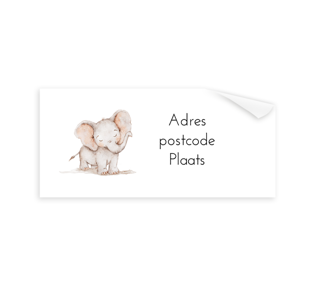 Wat een schattige adressticker passend bij het geboortekaartje! Op de witte sticker staat een illustratie van een olifantje. Pas het ontwerp naar wens zelf aan. Ieder vel bevat 12 stickers.