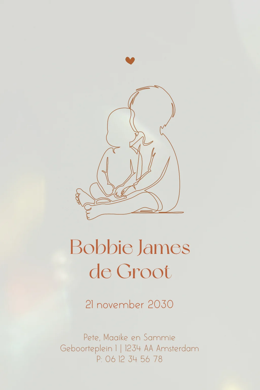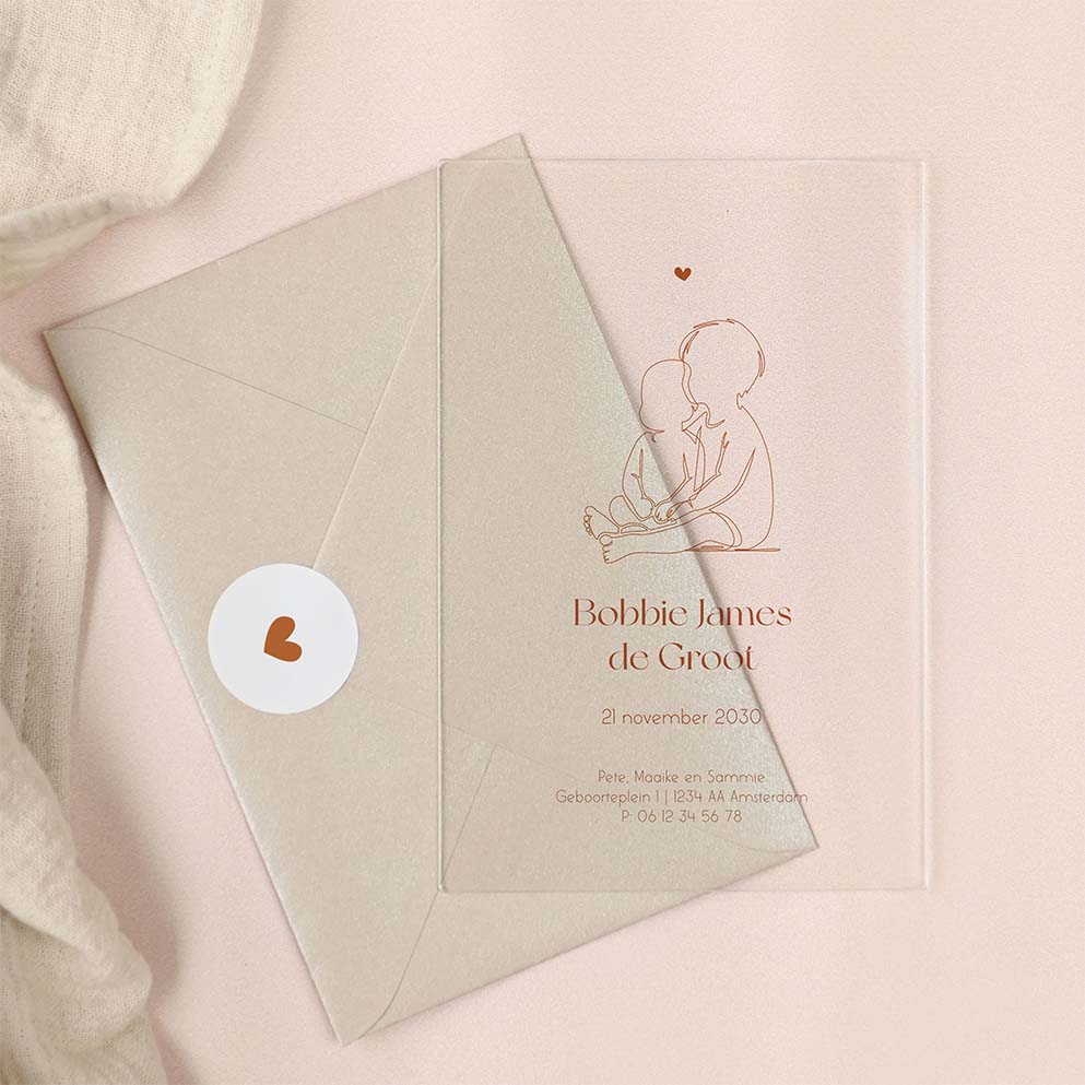 Een lief geboortekaartje voor jouw tweede kindje, een broertje! Het kaartje is gemaakt van acryl en heeft een lijntekening van een grote broer met zijn kleine broertje. Pas het ontwerp naar wens aan in onze online editor.