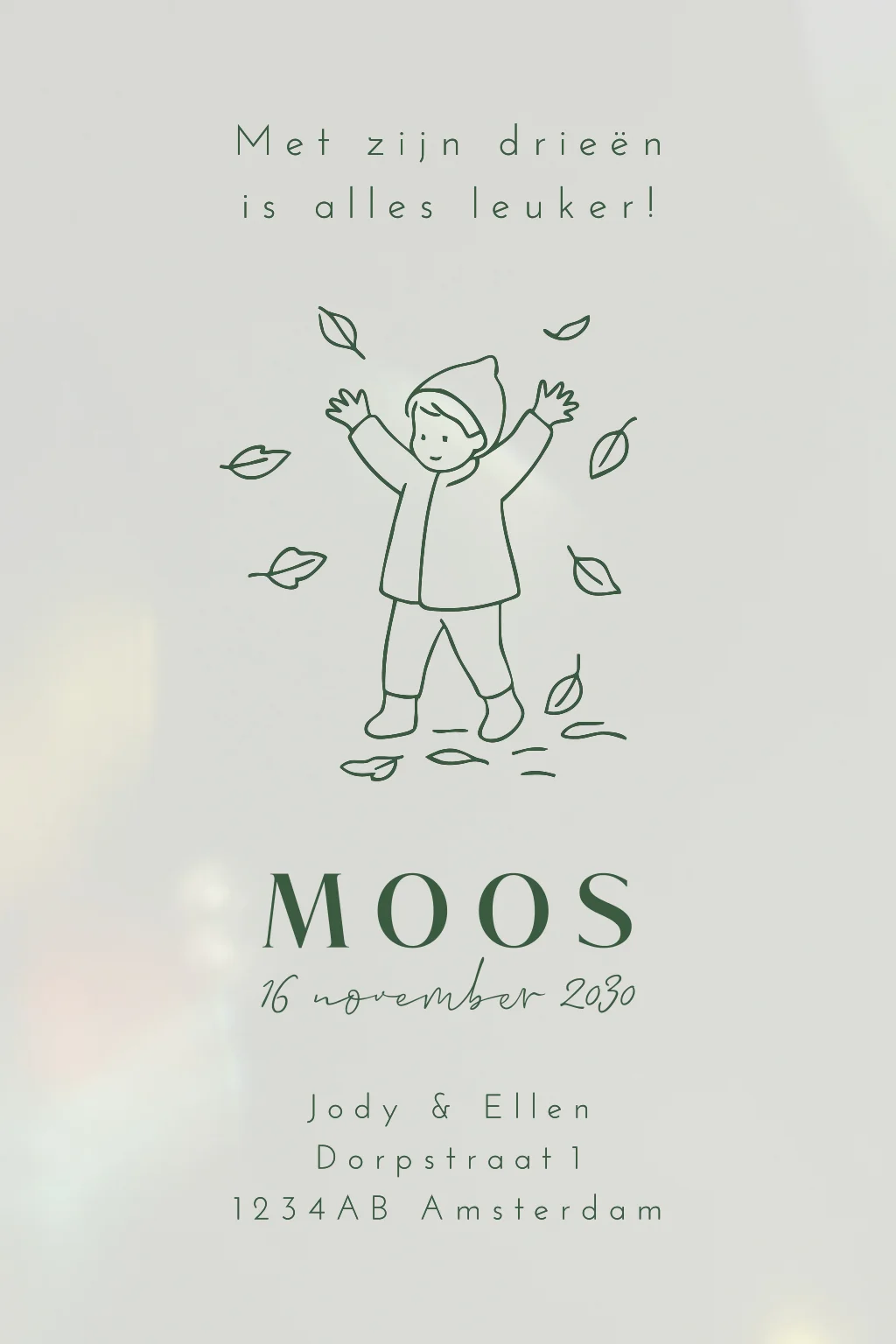 Een uniek en tof geboortekaartje voor jouw kindje. Het kaartje heeft een acryl basis met daarop een lieve illustratie van een jongen spelend tussen de herfstbladeren. Pas het ontwerp naar wens aan in onze online editor.