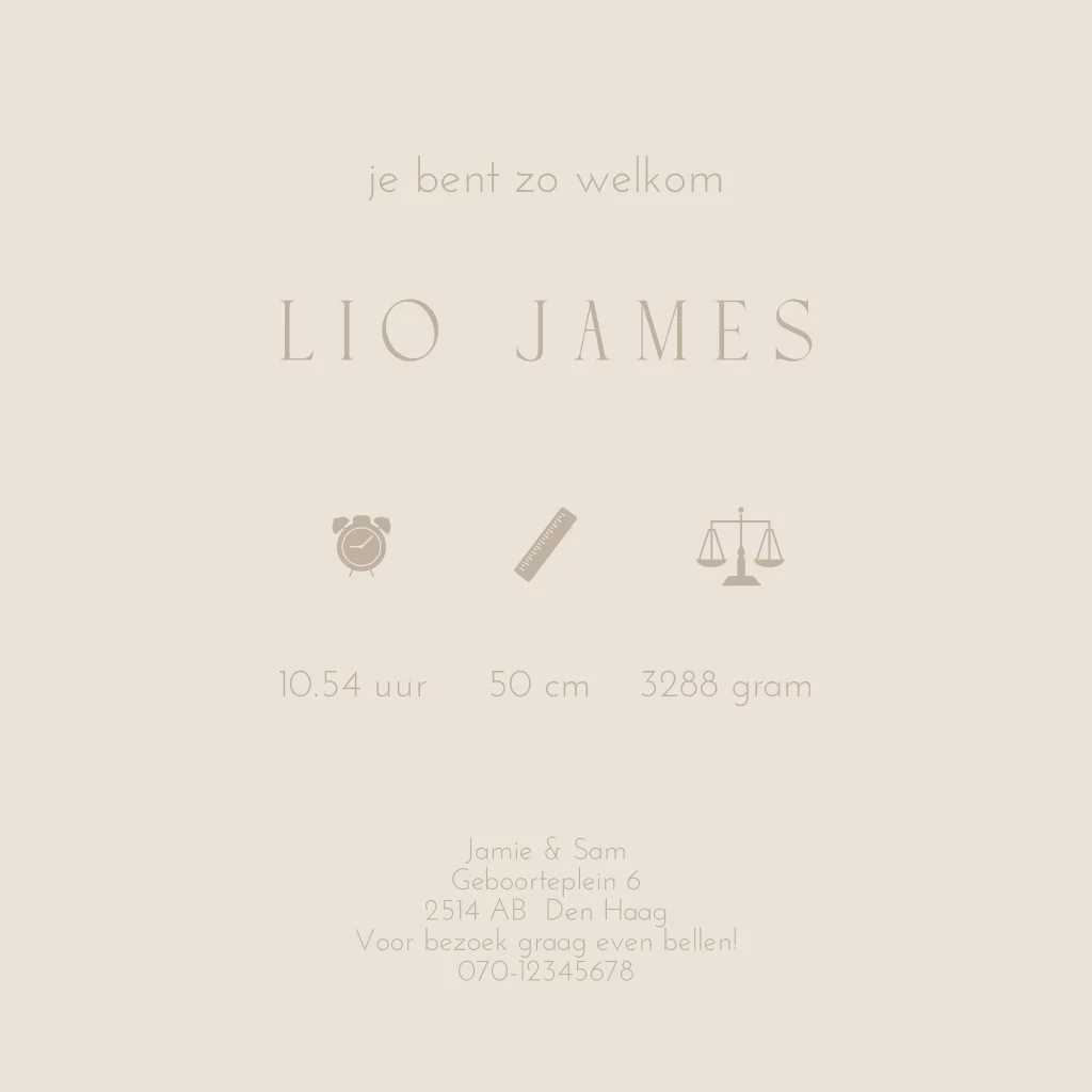 Een lief geboortekaartje voor jou derde kindje. Het kaartje heeft een beige achtergrond met daarop drie lieve silhouetjes van jouw kinderen. Pas het ontwerp naar wens aan in onze online editor.