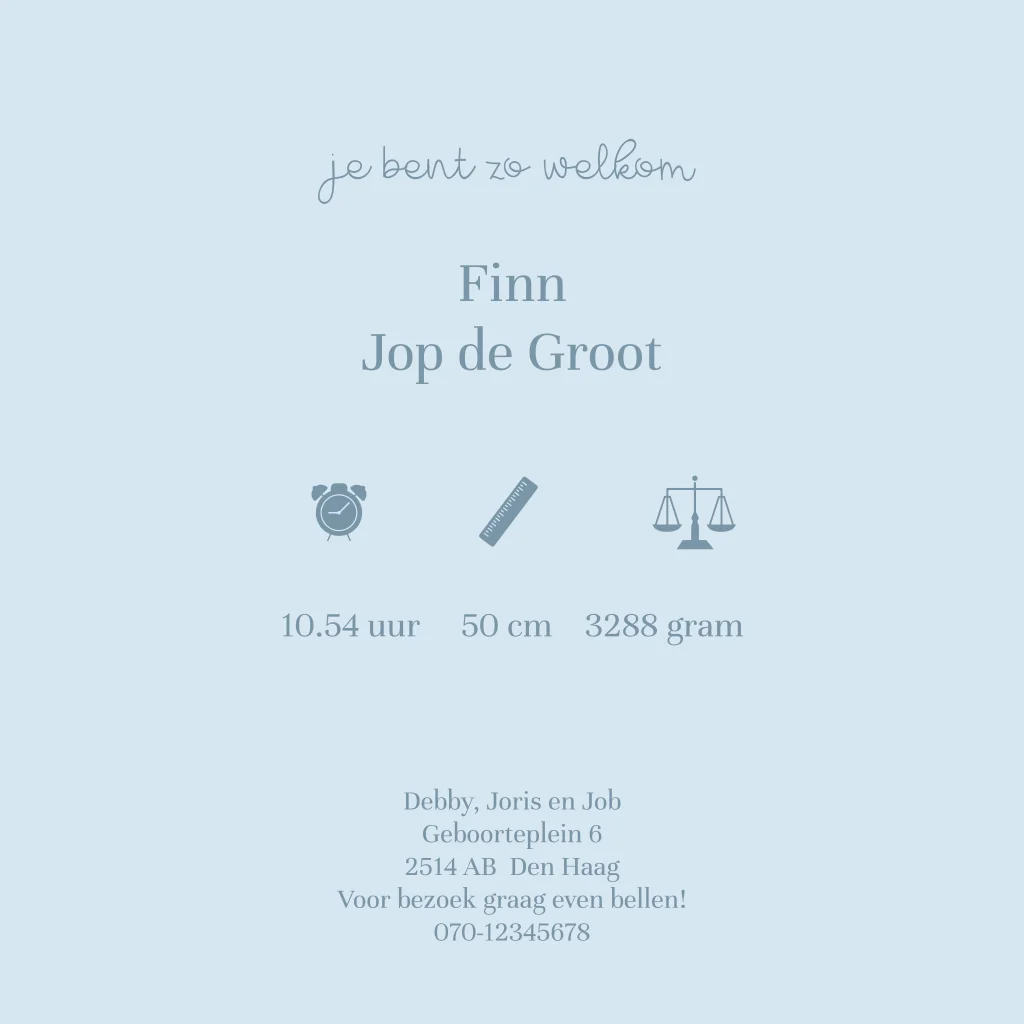 Welkom lief broertje! Dit blauwe geboortekaartje heeft ronde hoeken en een silhouetje van een grote broer boven het wiegje van haar broertje. Het kaartje is volledig naar wens aan te passen in onze online editor.