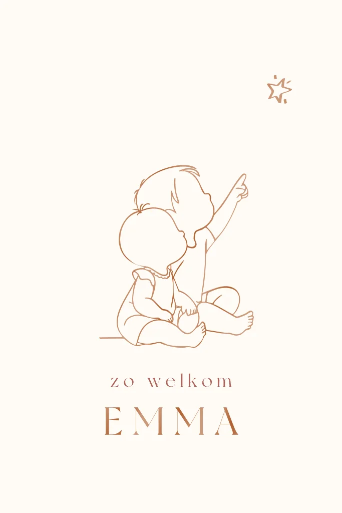 Schattig geboortekaartje met een grote broer en het zusje die naar een ster wijzen. De lijntekening en de naam worden in hoogglans gedrukt. Dit kaartje is perfect om de geboorte van jullie tweede kindje aan te kondigen. Personaliseer het ontwerp eenvoudig in onze online editor.