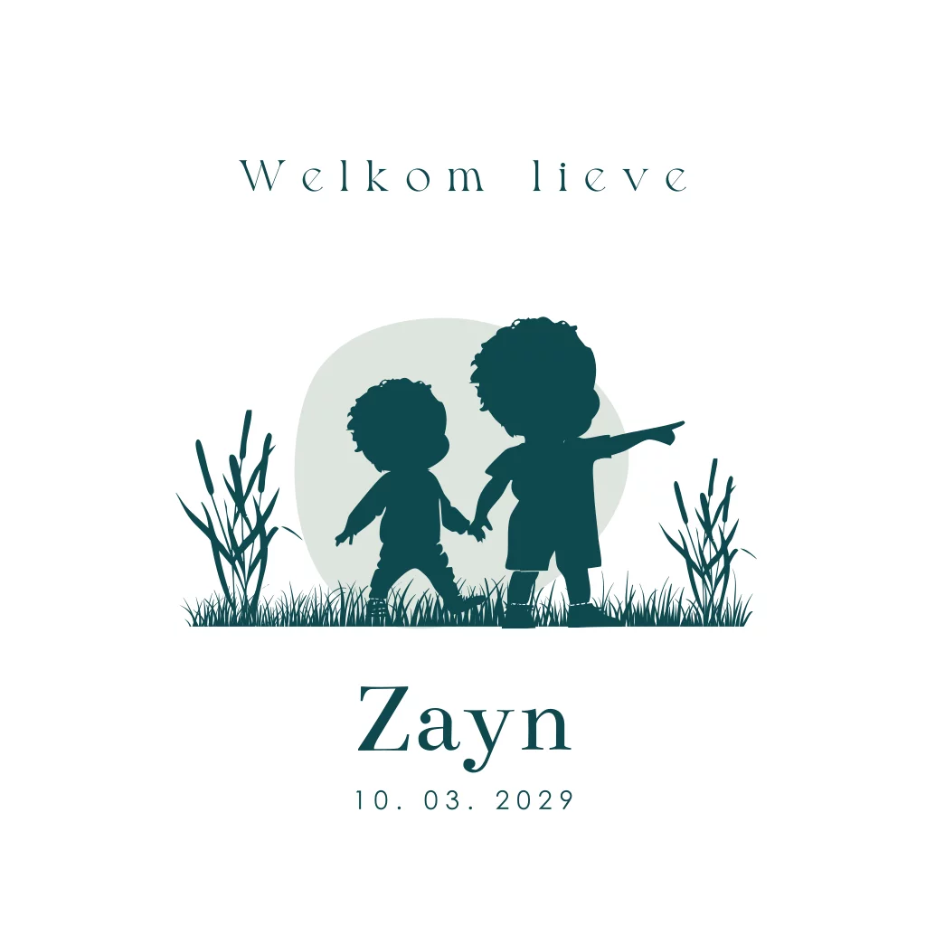 Een lief geboortekaartje met silhouetjes van een broer en zijn kleine broertje die wandelen in de natuur. Pas het kaartje naar wens aan in de online editor.