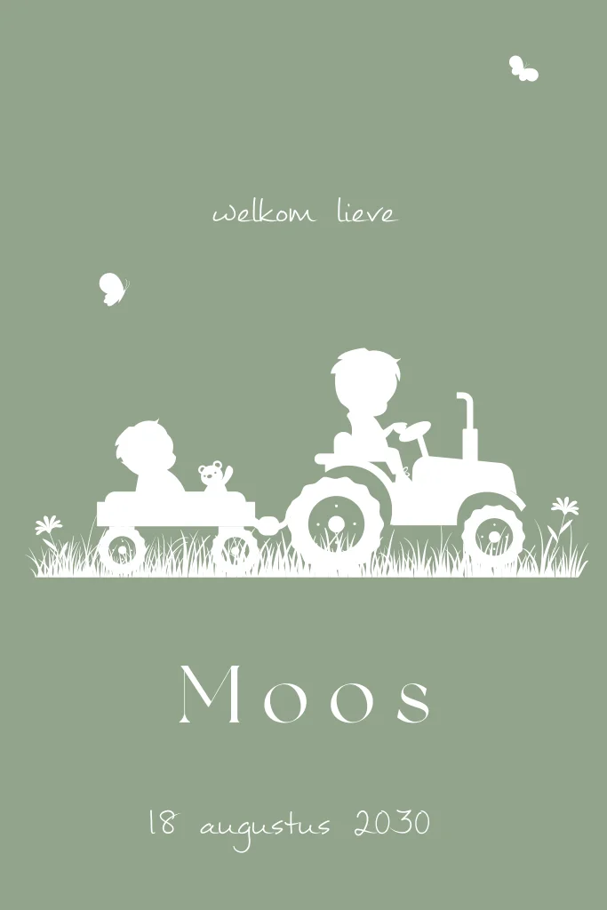 Lief geboortekaartje met een silhouet van een jongetje en zijn broertje dat op een trekker zit. Het geboortekaartje heeft een groene kleur en kan naar wens worden aangepast in de online editor.