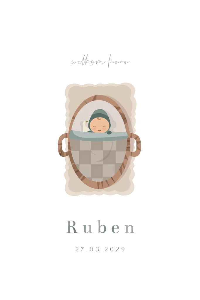 Wat een schattig geboortekaartje voor een jongen! Dit kaartje heeft een illustratie van een jongetje in een mozes mandje. De naam wordt gedrukt in hoogglans. Pas het ontwerp naar wens aan in onze online editor.