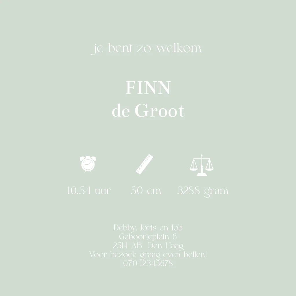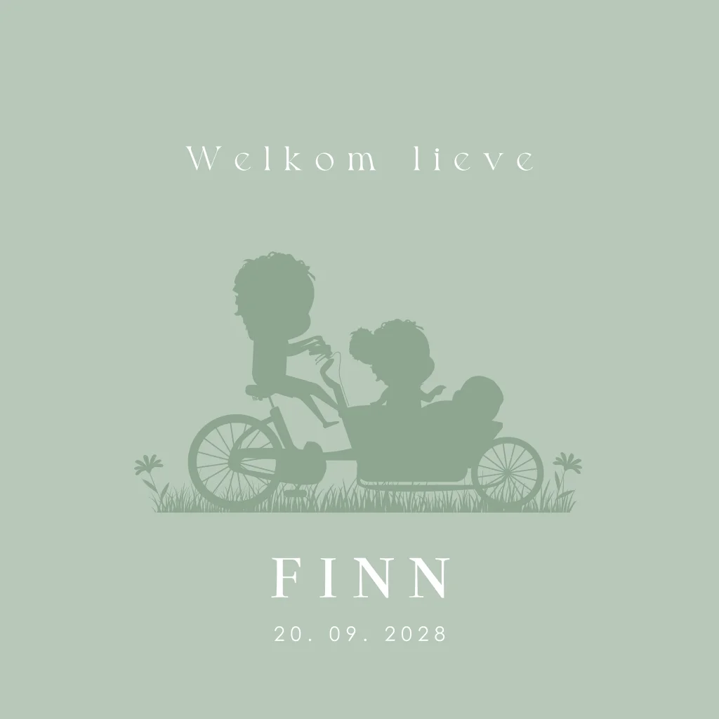 Wat een tof geboortekaartje! Dit kaartje heeft een groene achtergrond. Je ziet een lieve illustratie van een silhouetjes in een bakfiets. Zo zie je een grote zus en broer met hun kleine broertje. Pas het ontwerp naar wens zelf aan.