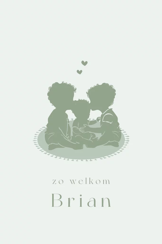 Lief groen geboortekaartje met twee broers die hun kleine broertje een kus geven. Pas het kaartje naar wens aan in de online editor.