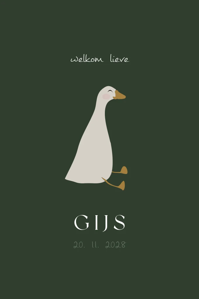 Dit is een leuk kaartje voor de geboorte van je zoon. Op een donkergroene achtergrond zie je een zittende gans. Pas het kaartje helemaal naar wens aan in onze online editor.
