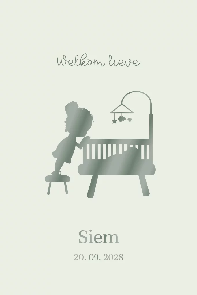 Welkom lief broertje! Dit staande lichtgroene geboortekaartje heeft ronde hoeken en een silhouetje van een grote zus boven het wiegje van haar broertje. Het kaartje heeft prachtige hoogglans details en is volledig naar wens aan te passen in onze online editor.