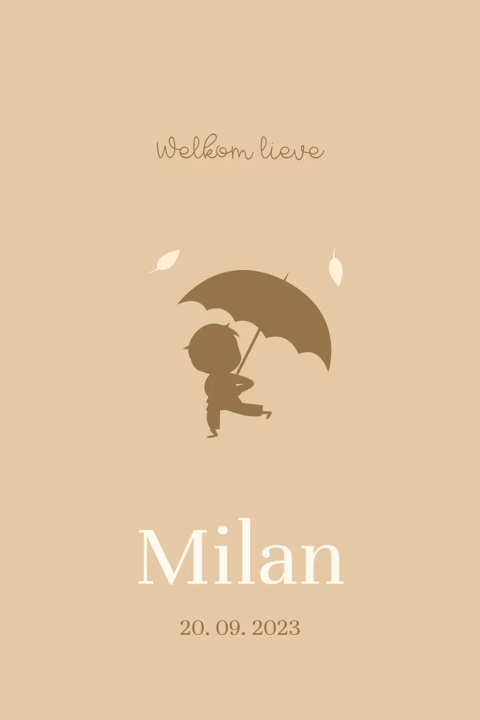Een vrolijk herfst geboortekaartje voor een jongen. Het kaartje heeft een karamel kleurige achtergrond. Daarop zie je een lief silhouetje van een jongetje met een paraplu. Pas het kaartje naar wens aan in onze online editor.