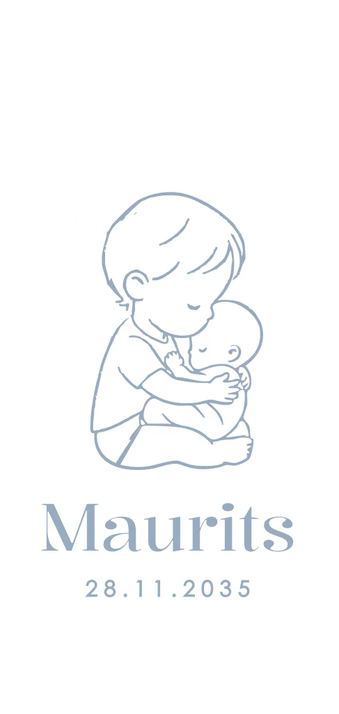 Lief geboortekaartje waarop de grote broer zijn kleine broertje knuffelt. Het kaartje met blauwe accenten heeft een zachte uitstraling en kan eenvoudig naar wens worden aangepast in onze online editor.