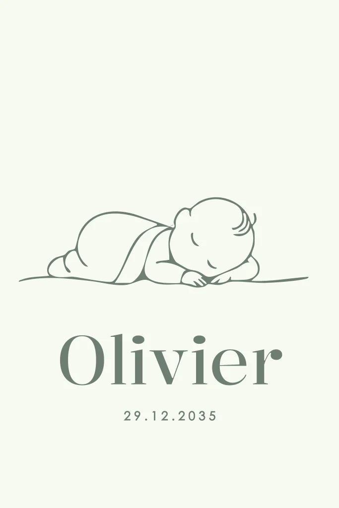 Dit lieve geboortekaartje toont een slapende baby in een mooie lijntekening op een groene achtergrond. Perfect om de geboorte van jullie zoon aan te kondigen. Pas het ontwerp naar wens aan in onze online editor.Plaats zelf de teksten en elementen eenvoudig op de juiste plek in onze opmaaktool. Heb je hier hulp bij nodig? Neem gerust even contact met ons op!