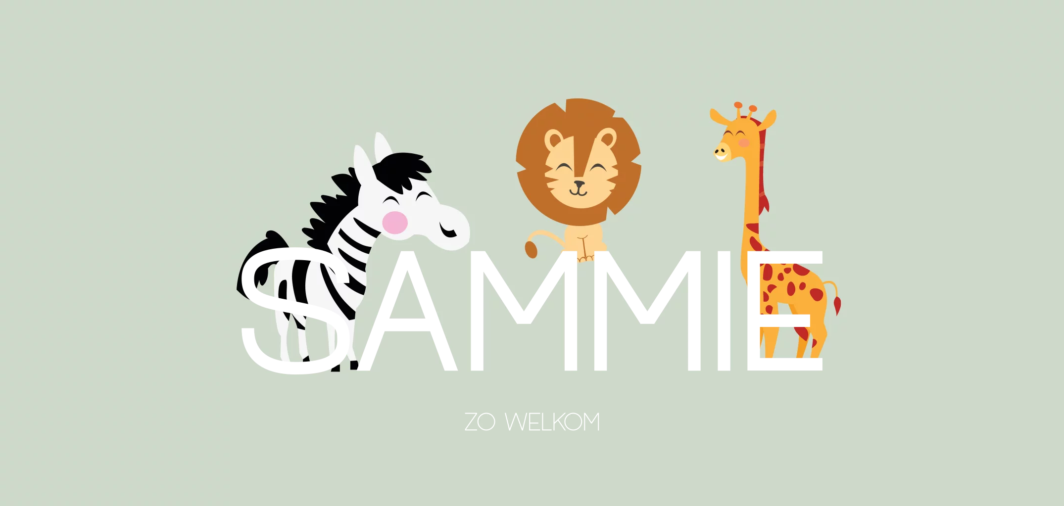 Een vrolijk liggend geboortekaartje met ronde hoeken voor jullie kleintje. Het kaartje heeft vrolijke tekeningen van de verschillende jungledieren: zebra, leeuw en giraf. De naam is gedrukt in goudfolie en laat het kaartje echt sprankelen.