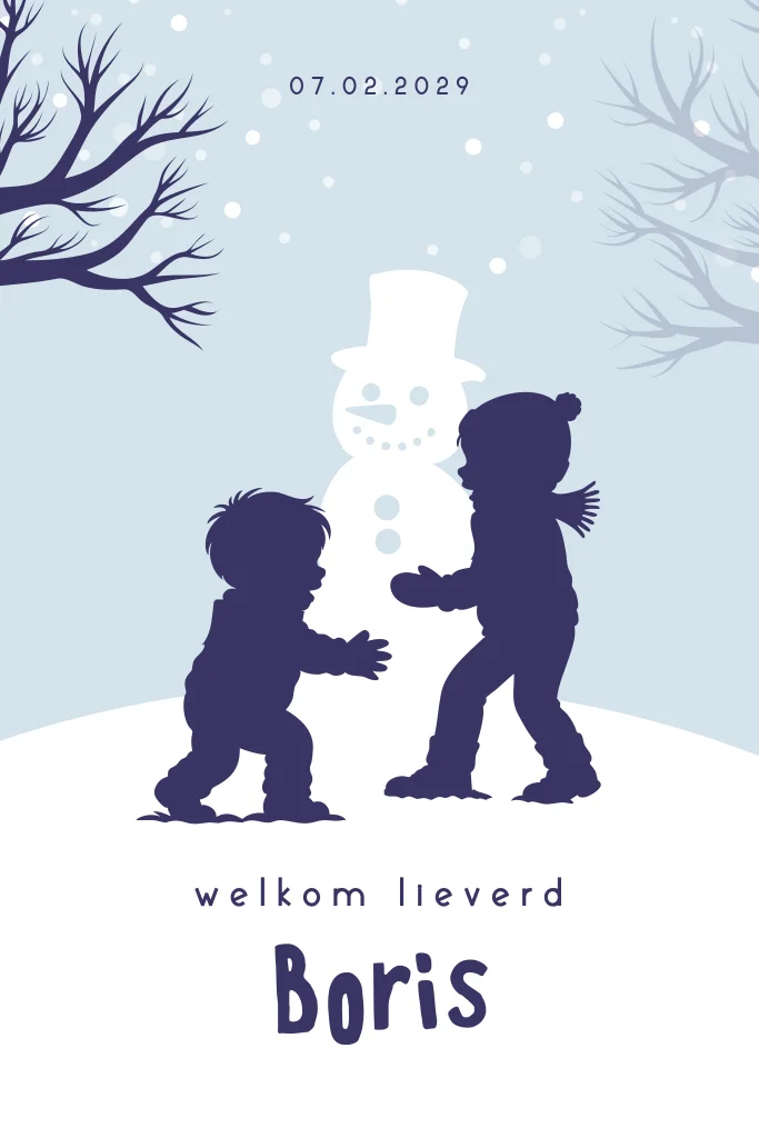 Een vrolijk winters geboortekaartje voor jouw tweede kindje, een zoon. Het kaartje heeft blauwe tinten en silhouetjes van twee kindjes spelend bij een sneeuwpop. Pas het ontwerp naar wens zelf aan.