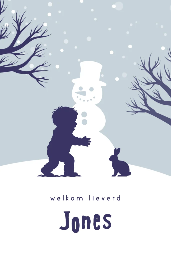Een vrolijk winters geboortekaartje voor jouw zoon. Het kaartje heeft blauwe tinten en een silhouetje van een kindje spelend bij een sneeuwpop. Pas het ontwerp naar wens zelf aan.