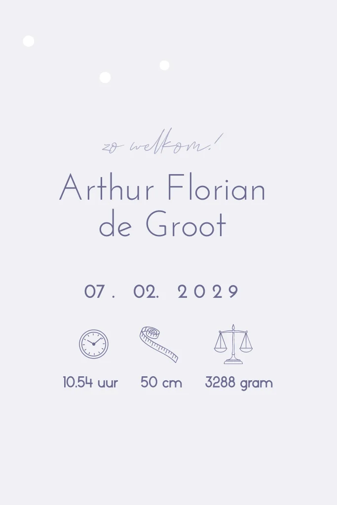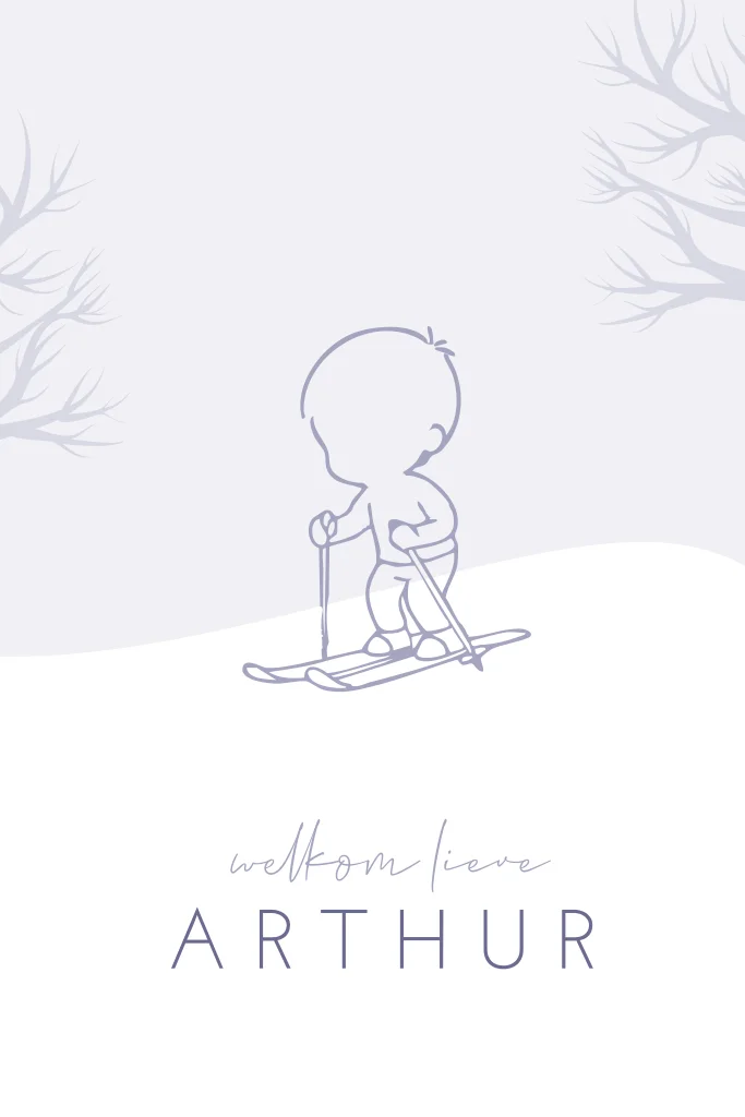 Wat een leuk geboortekaartje voor de geboorte van een zoon in het winterseizoen! De kaart heeft een mooie lijntekening van een jongetje op ski’s. In de online editor kun je het geboortekaartje helemaal naar wens opmaken.