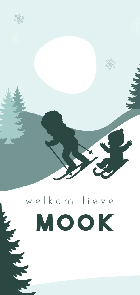 Winters groen geboortekaartje met silhouetjes van broertjes op ski's