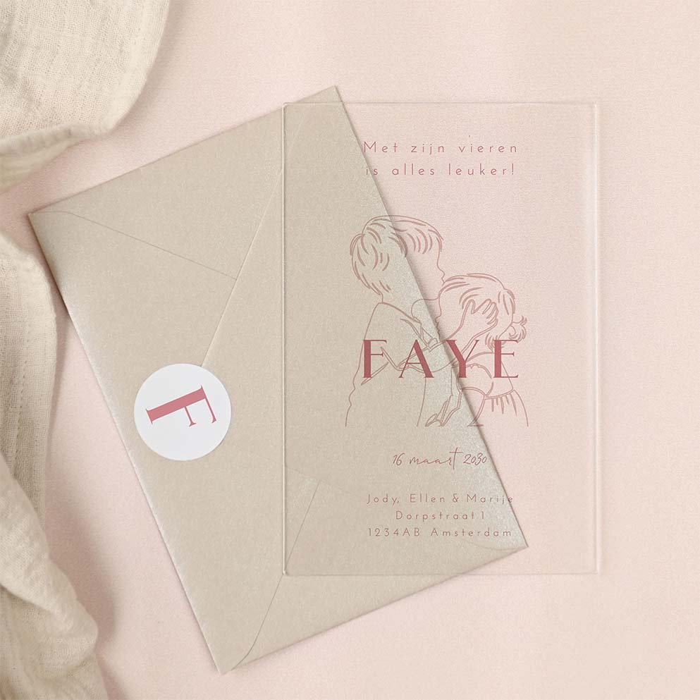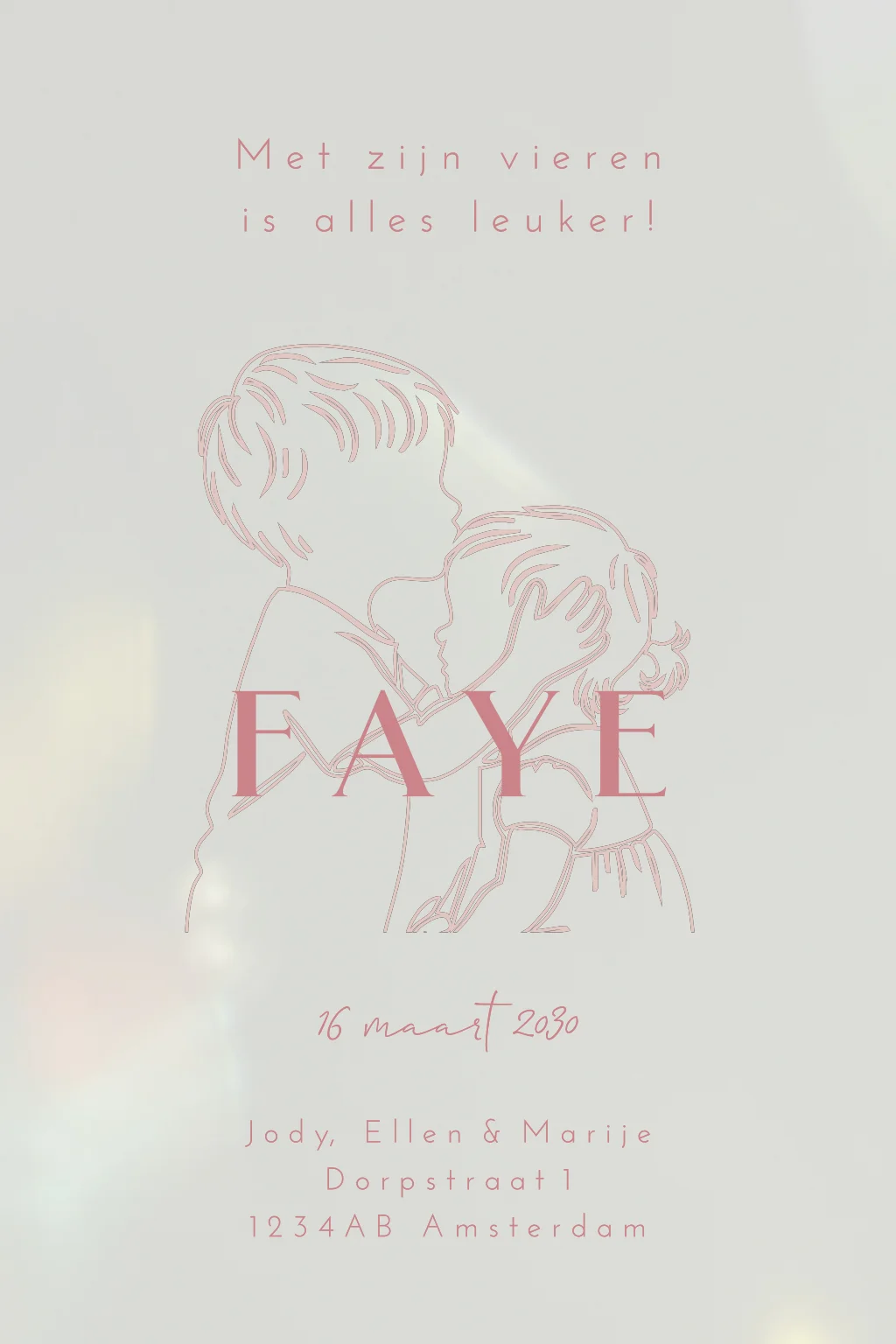 Een lief geboortekaartje voor jouw tweede kindje, een zusje! Het kaartje is gemaakt van acryl en heeft een lijntekening van een grote broer met zijn kleine zusje. Pas het ontwerp naar wens aan in onze online editor.