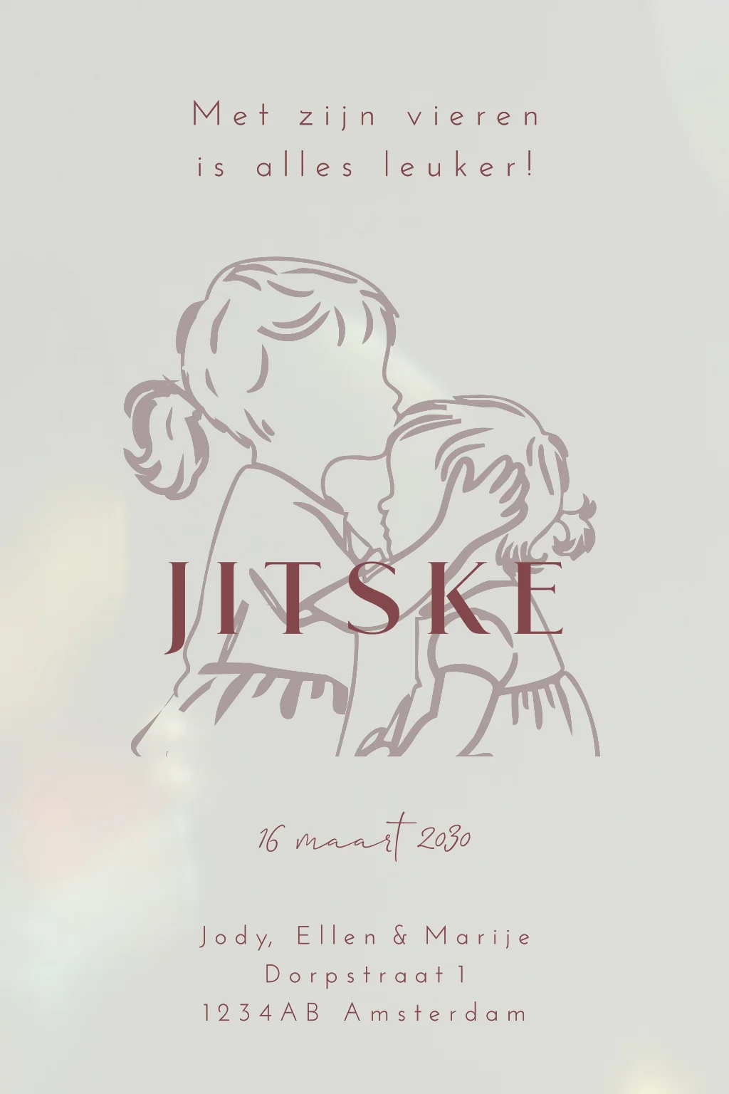 Een lief geboortekaartje voor jouw tweede kindje, een zusje! Het kaartje is gemaakt van acryl en heeft een lijntekening van een grote zus met haar kleine zusje. Pas het ontwerp naar wens aan in onze online editor.