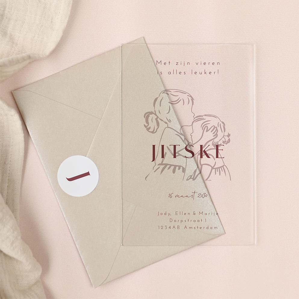 Acryl geboortekaartje meisje met lijntekening zusjes