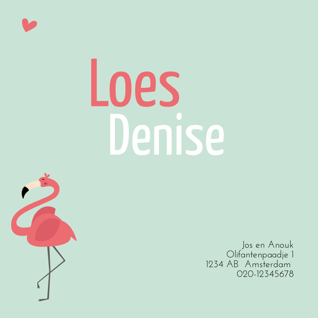 Vrolijk geboortekaartje voor een meisje met twee flamingo´s en hartjes op een zacht groene achtergrond. De achtergrondkleur is naar eigen smaak aan te passen.
