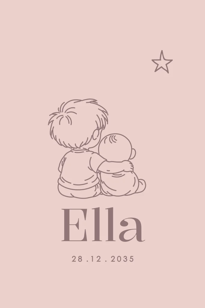 Lief geboortekaartje met een minimalistische lijntekening van een trotse grote broer samen met zijn zusje. Het zachte ontwerp straalt warmte en verbondenheid uit. Volledig aan te passen in de online editor voor een persoonlijk geboortekaartje.