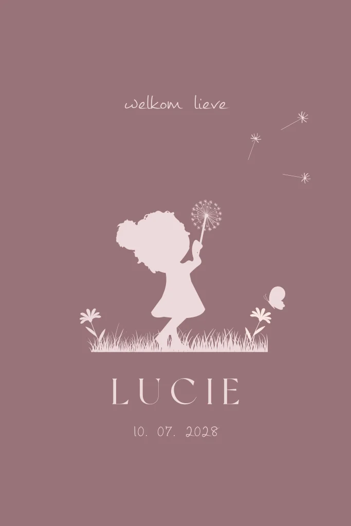 Kondig de geboorte van je dochter aan met dit kaartje. Op het kaartje is het silhouet van een meisje te zien met een paardenbloem in haar hand. Het kaartje kan helemaal naar wens aangepast worden in onze online editor.