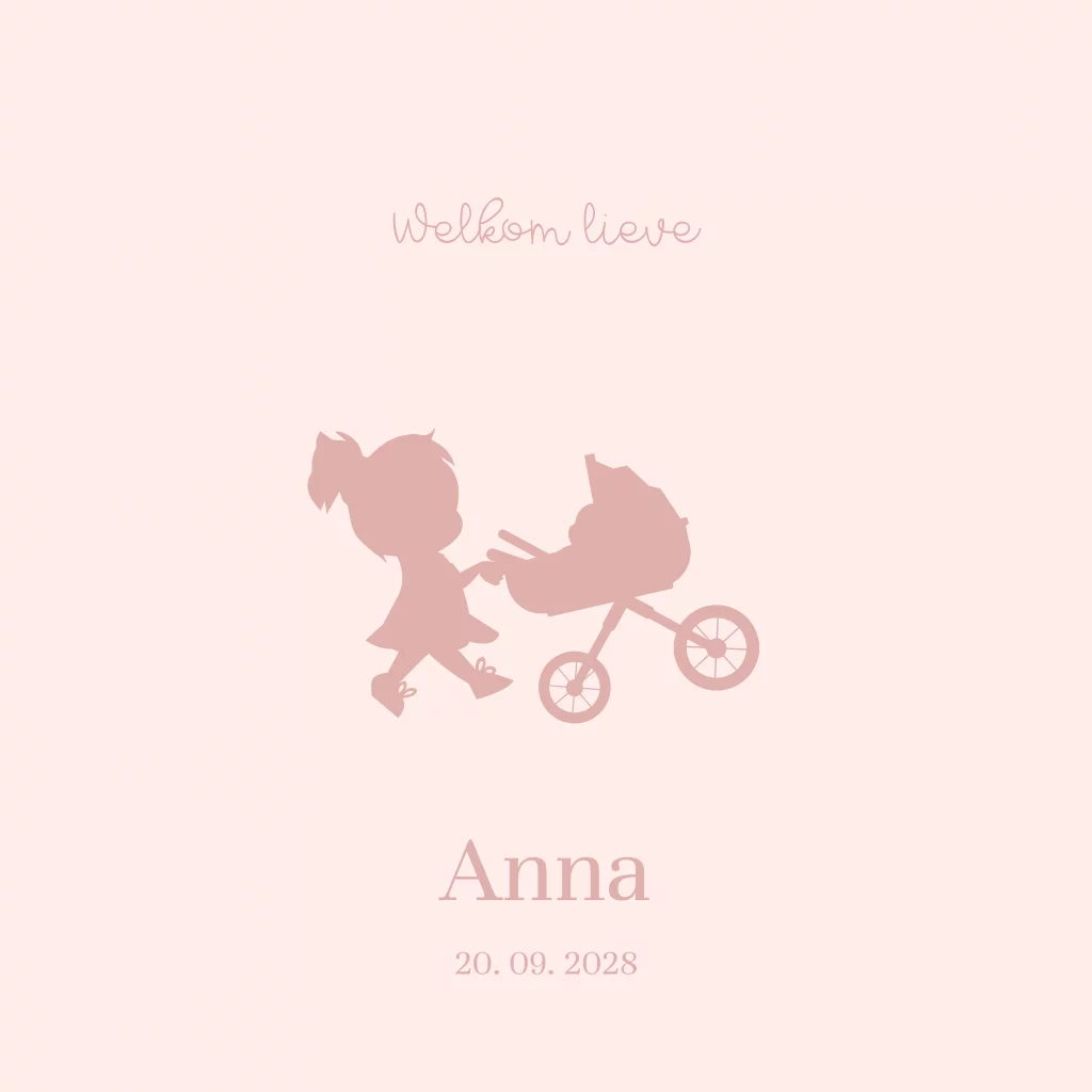 Dit is een lief geboortekaartje voor jullie pasgeboren dochter en zusje. Op een lichtroze achtergrond staat de illustratie van een grote zus die met haar zusje in de kinderwagen aan het lopen is. Het kaartje is helemaal naar wens aan te passen in onze online editor.