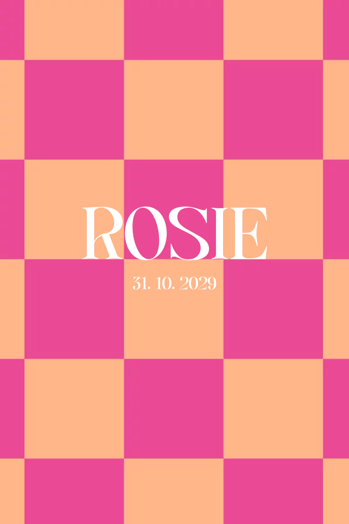 Een hip geboortekaartje met een speels ruitjespatroon. Het kaartje heeft een oranje achtergrond met daarop een roze ruitjespatroon. De naam wordt gedrukt in holografisch foliedruk.