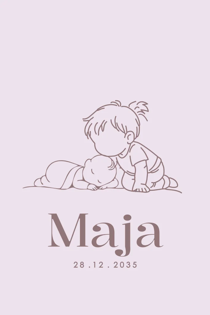 Lief geboortekaartje met baby en grote zus in lijntekening op een roze achtergrond, pas je ontwerp aan in onze online editor.Dit design is nu toegevoegd aan je eigen collectie.