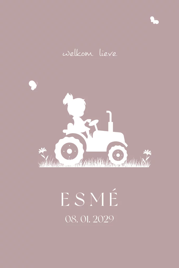 Lief geboortekaartje met een silhouet van een meisje dat op een trekker zit. Pas het kaartje naar wens aan in de online editor.