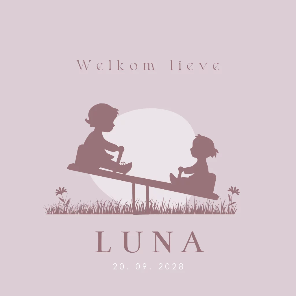 Lief geboortjekaartje met een silhouet van twee meisjes die op een wip zitten. Pas het kaartje naar wens aan in de online editor.