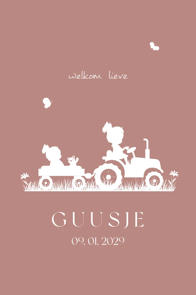 Lief geboortekaartje met een silhouet van een twee zusjes die op een trekker en aanhanger zitten. Pas het kaartje naar wens aan in de online editor.