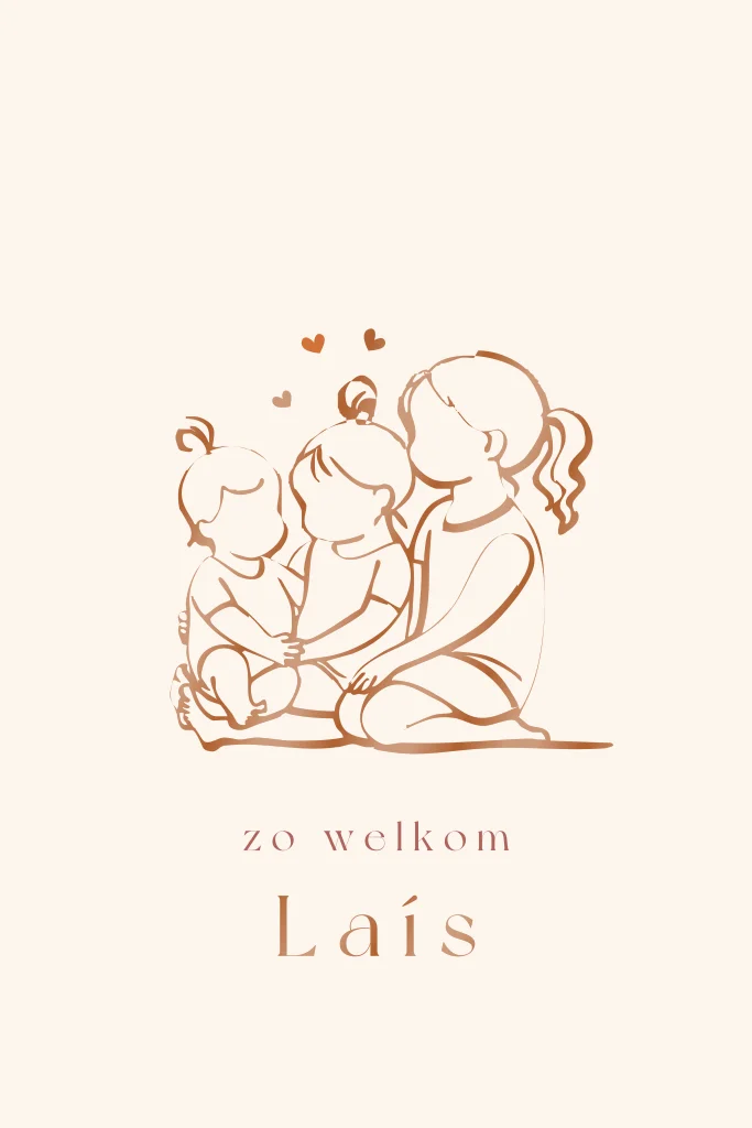 Lief geboortekaartje met tekening van drie kinderen. De naam en de lijntekening van de zusjes worden in hoogglans gedrukt. Personaliseer eenvoudig de babykaart in onze editor.