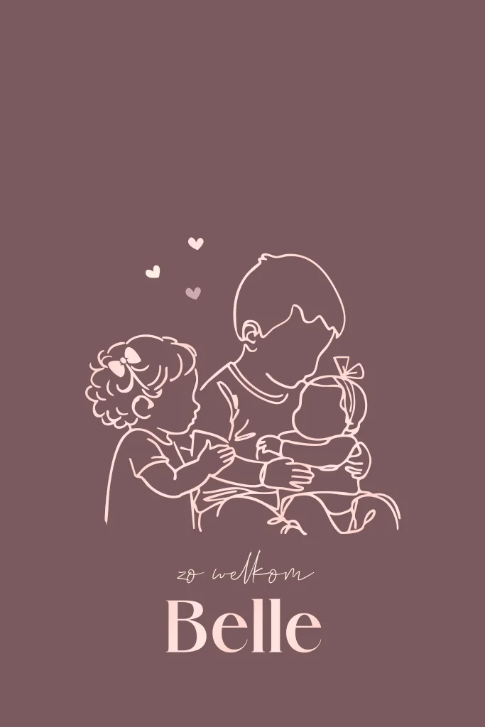 Een lief geboortekaartje voor een derde kind met grote broer en zus in lijntekening. Pas het ontwerp aan in onze online editor.