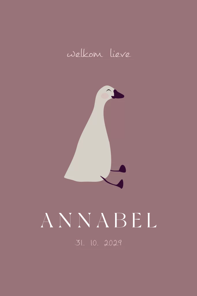 Dit is een mooi kaartje om de geboorte van je dochter aan te kondigen. Het kaartje heeft een paarse achtergrond met de illustratie van een zittende gans. De roségoudfolie details geven dit kaartje een luxe uitstraling. Het kaartje kan naar wens aangepast worden in onze online editor.