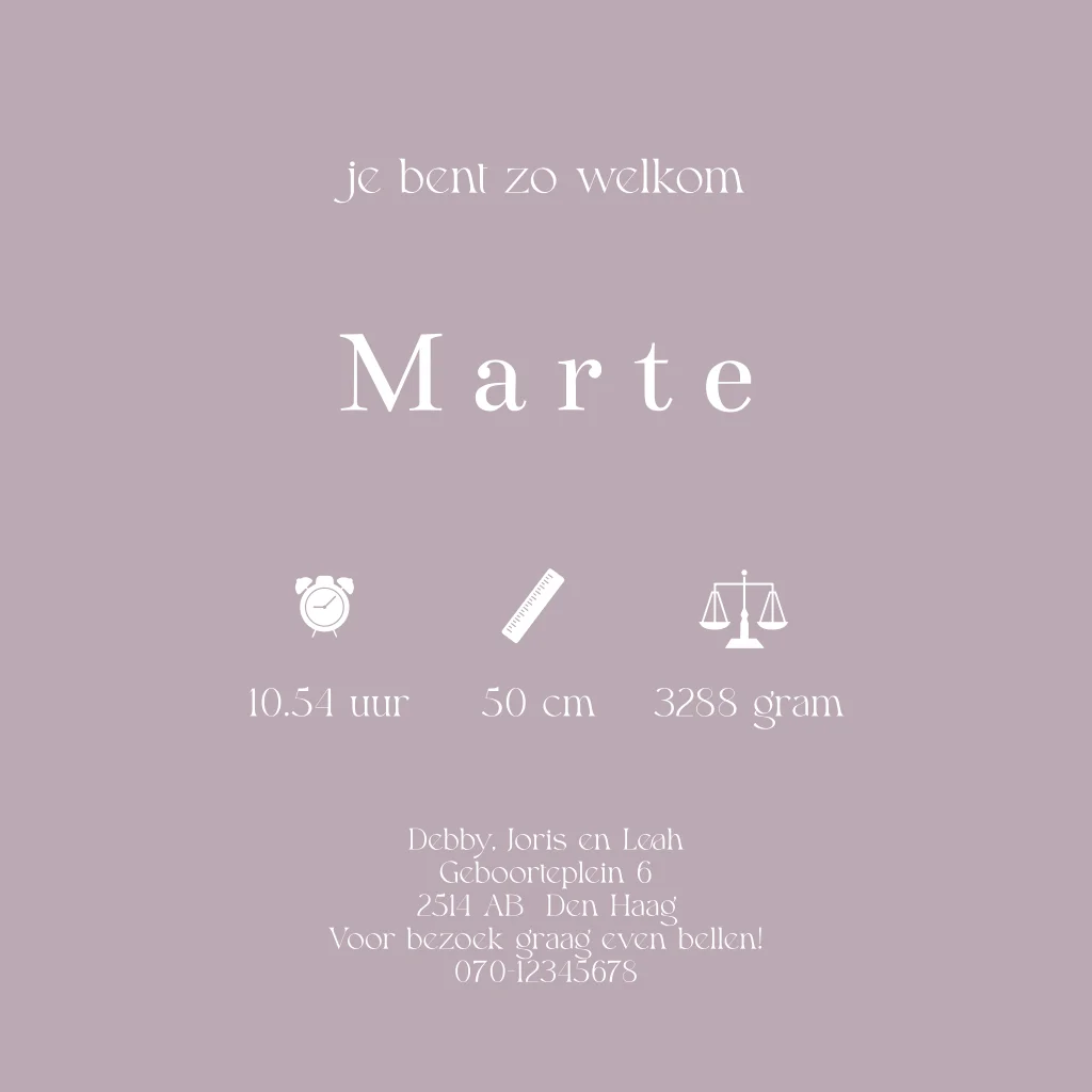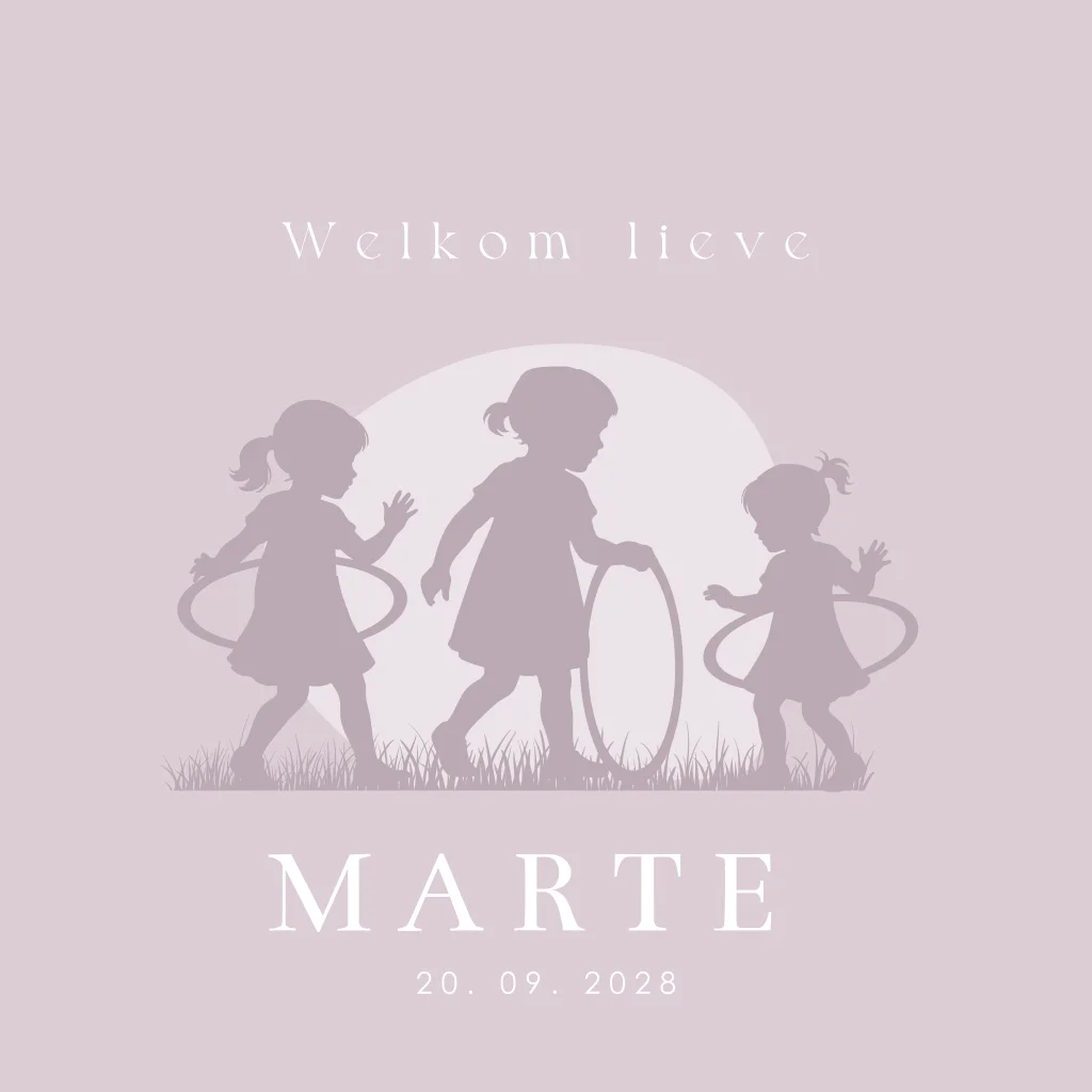 Hoera! Een derde meisje. Met dit paarse kaartje kan je de geboorte van jullie derde dochter aankondigen. Het kaartje heeft schattige illustraties van drie zusjes die spelen met een hoepel. Pas het ontwerp naar wens zelf aan.
