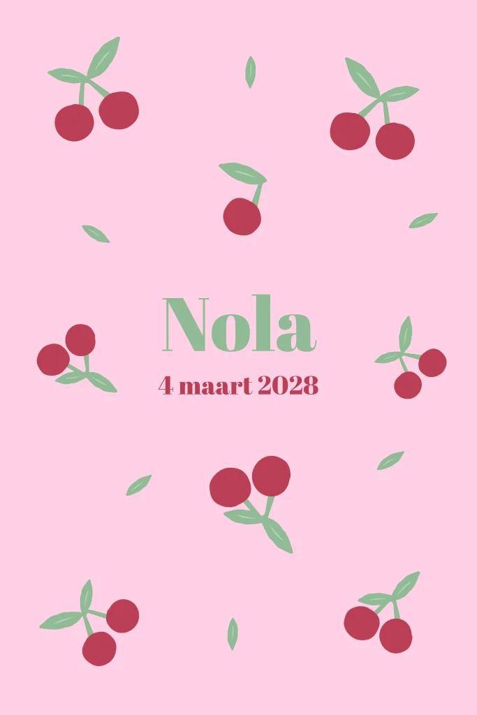 Een vrolijk geboortekaartje voor jouw meisje. Het kaartje heeft een staand formaat met een kersen patroon. De achtergrond heeft een roze achtergrond. Pas het ontwerp naar wens aan in onze online editor.