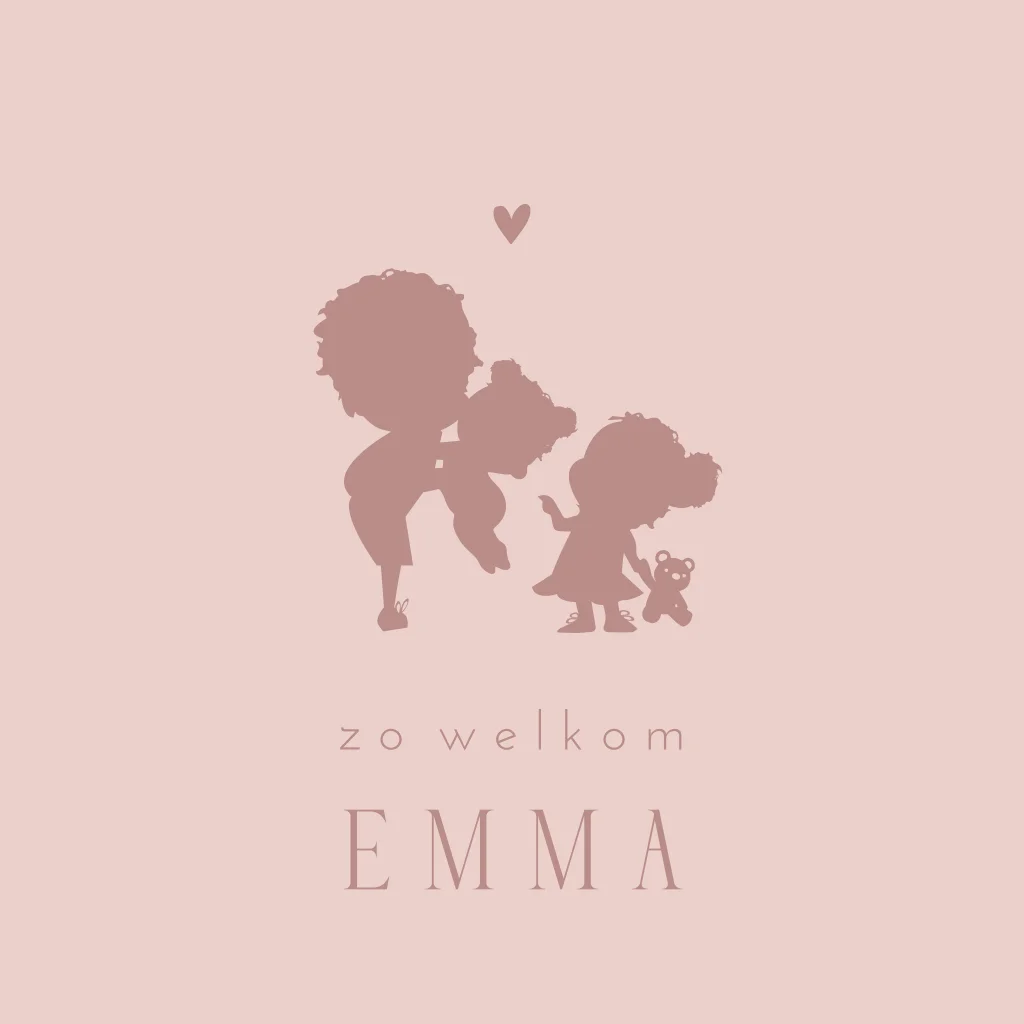 Lief geboortekaartje met silhouetjes van grote broer en zus met zusje
