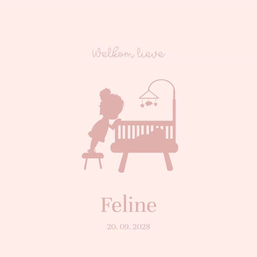 Welkom lief zusje! Dit roze geboortekaartje heeft ronde hoeken en een silhouetje van een grote zus boven het wiegje van haar zusje. Het kaartje is volledig naar wens aan te passen in onze online editor.