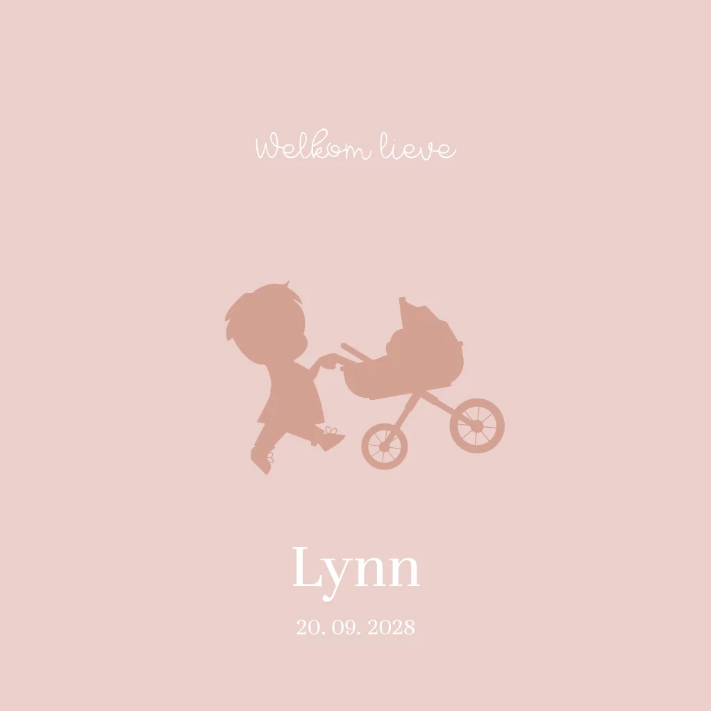 Dit is een lief geboortekaartje voor jullie pasgeboren dochter en zusje. Op een lichtroze achtergrond staat de illustratie van een grote broer die met zijn zusje in de kinderwagen aan het lopen is. Het kaartje is helemaal naar wens aan te passen in onze online editor.