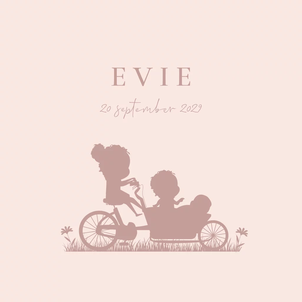 Wat een lief geboortekaartje! Dit kaartje heeft een roze achtergrond. Je ziet een lieve illustratie van een silhouetjes in een bakfiets. Zo zie je een grote zus en broer met hun kleine zusje.