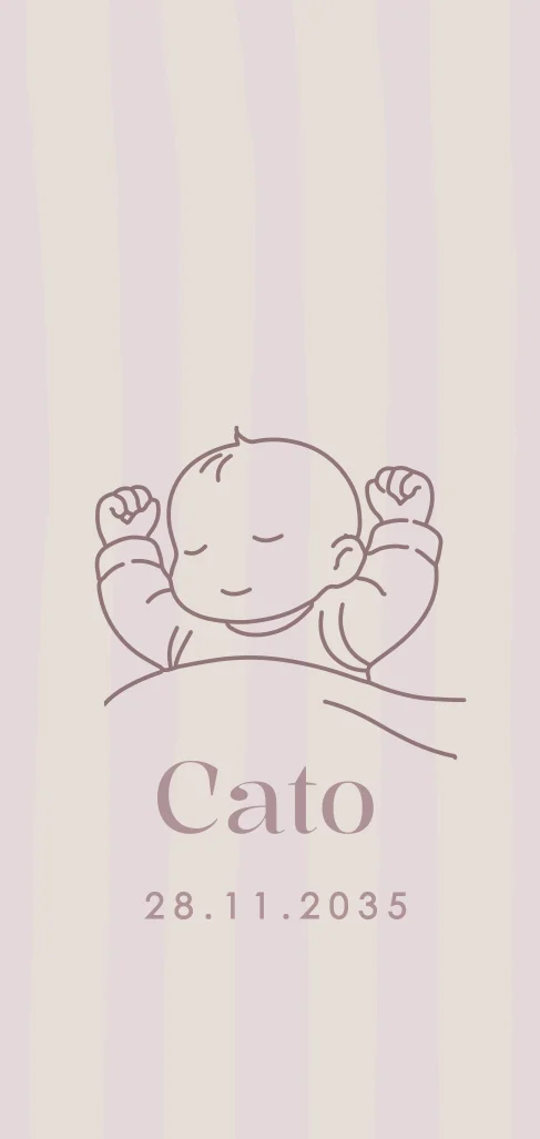 Lief geboortekaartje voor een meisje, met een subtiele lijntekening van een baby op een lila-gestreepte achtergrond. Het minimalistische ontwerp straalt rust en zachtheid uit en is perfect om de komst van je dochter op een stijlvolle manier aan te kondigen. Personaliseer het kaartje eenvoudig naar wens in onze online editor.Plaats zelf de teksten en elementen eenvoudig op de juiste plek in onze opmaaktool. Heb je hier hulp bij nodig? Neem gerust even contact met ons op!