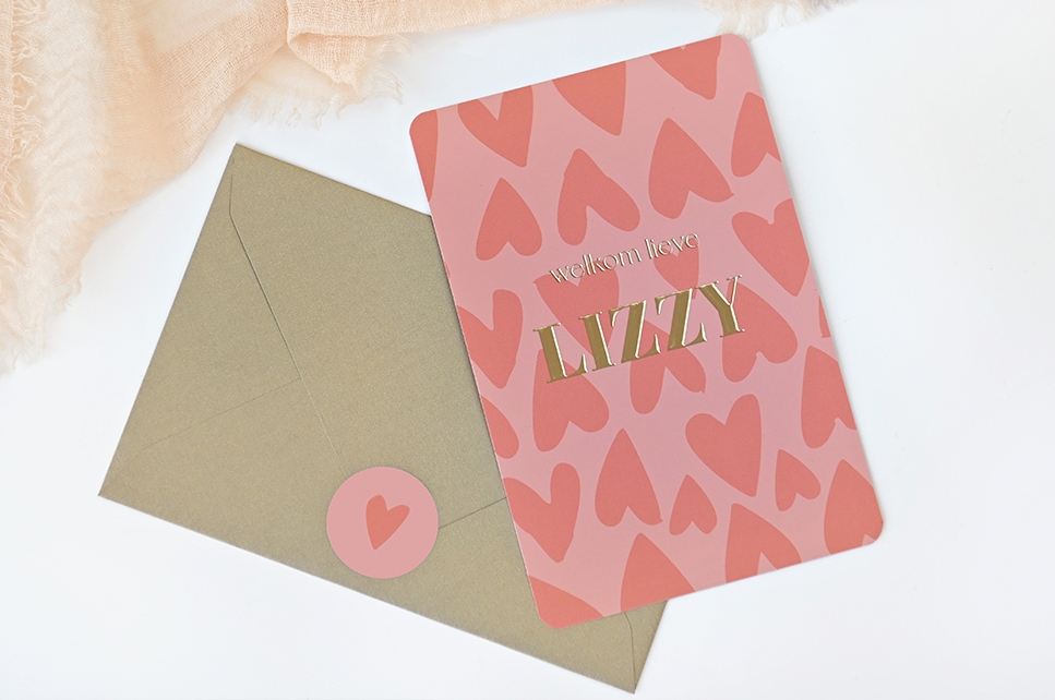 Hip en kleurig geboortekaartjes met een achtergrond vol met hartjes. De naam wordt gedrukt in goudfolie. De kleuren zijn nog naar eigen smaak aan te passen.