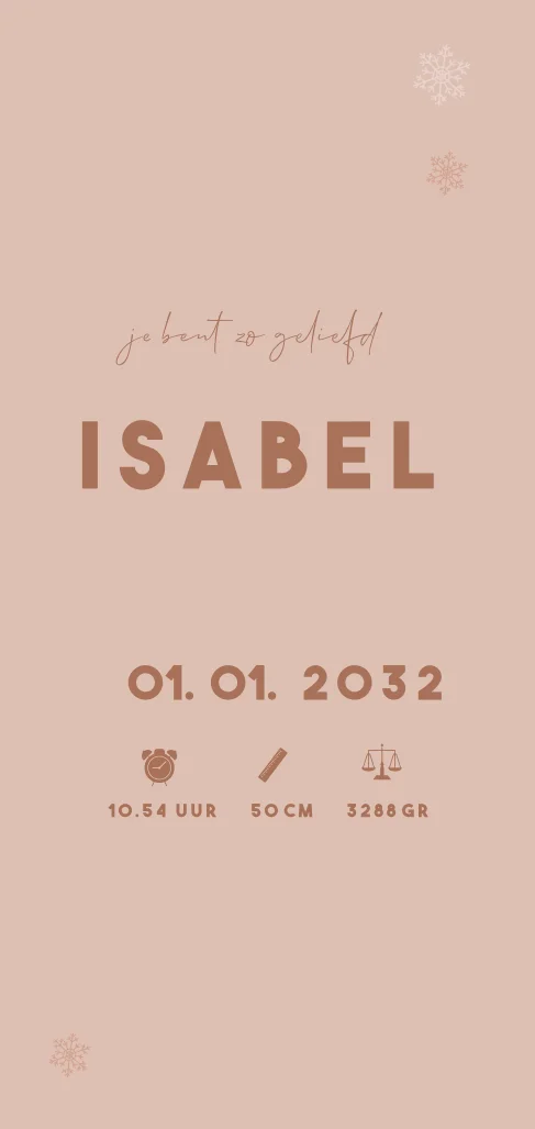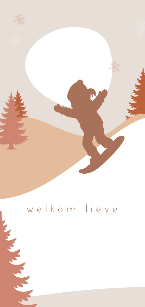 Een winters geboortekaartje voor jouw dochter. Het kaartje heeft een vrolijke illustratie van een meisje op een snowboard. De naam wordt gedrukt in foliedruk. Pas het ontwerp naar wens zelf aan.