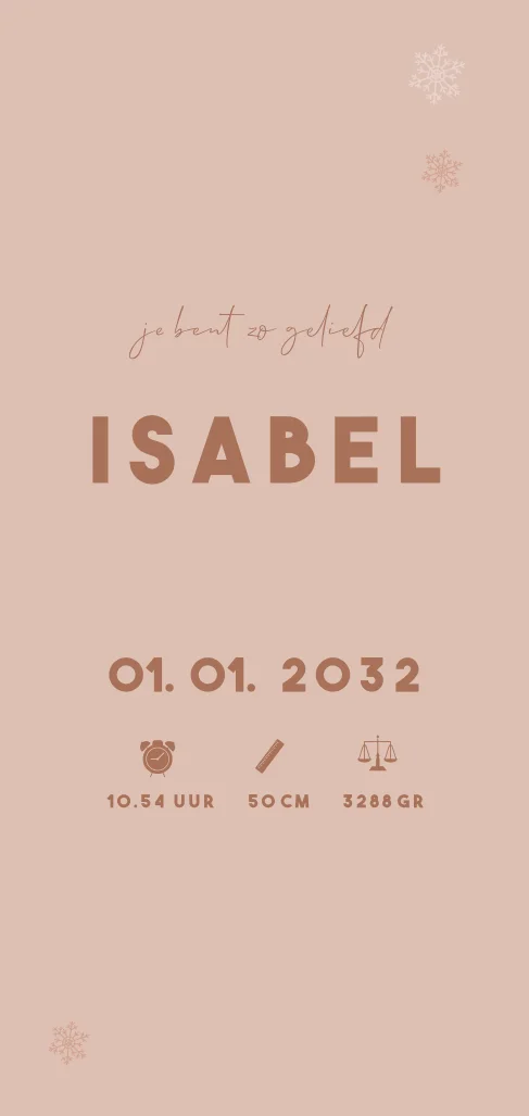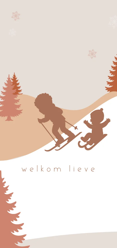 Een winters geboortekaartje voor jouw tweede kind, een dochter. Het kaartje heeft een vrolijke illustratie van een grote broer met zijn zusje in de sneeuw. De naam wordt gedrukt in foliedruk. Pas het ontwerp naar wens zelf aan.