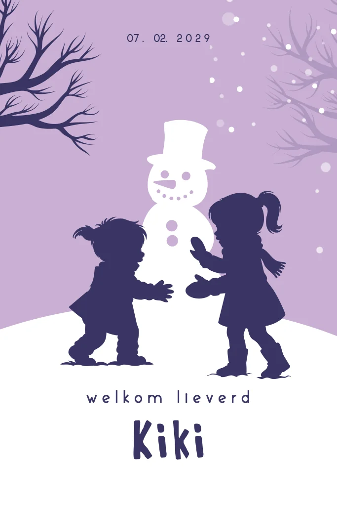 Een vrolijk winters geboortekaartje voor jouw tweede kindje, een dochter. Het kaartje heeft paarse tinten en silhouetjes van twee kindjes spelend bij een sneeuwpop. Pas het ontwerp naar wens zelf aan.