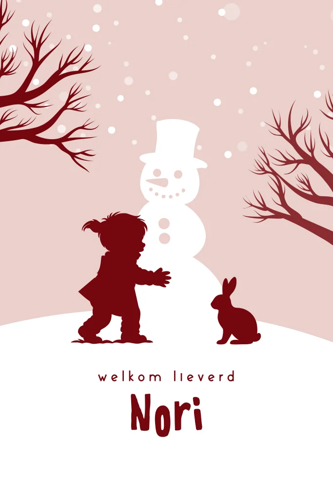 Een vrolijk winters geboortekaartje voor jouw dochter. Het kaartje heeft roze tinten en een silhouetje van een kindje spelend bij een sneeuwpop. Pas het ontwerp naar wens zelf aan.