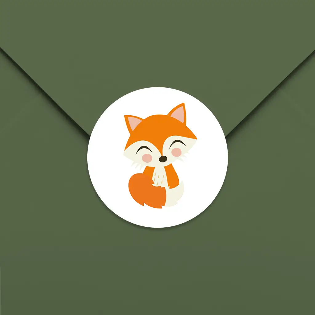 Een schattige sluitzegel met een vosje. De sluitsticker past leuk bij een van de bosdieren kaartjes van onze designer Alma Langerak. De achtergond van de sticker kan je aanpassen in onze editor. De sluitstickers hebben een diameter van 35 mm en worden geleverd op vellen van 25 stuks.