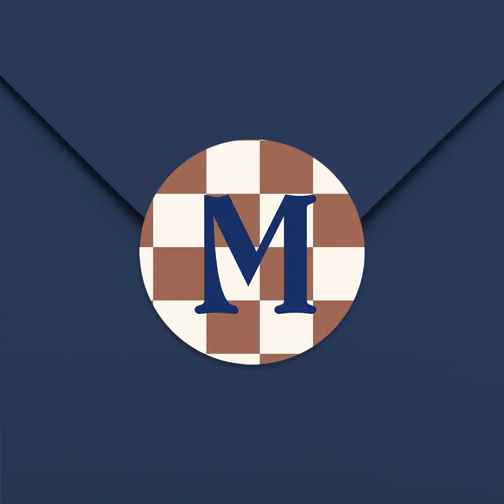 Stoere sluitsticker met bruin ruitjespatroon en blauwe letter. Pas de sticker aan in onze online editor.